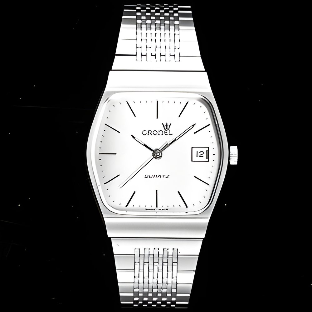 Fashionably in the swing of things, a quartz watch whose metal bracelet elegantly matches its six-sided, round-angle case. Broad silvered dial with 12 luminescent raised hour markers. Centre second hand and calendar. (CRONEL - Quartz)