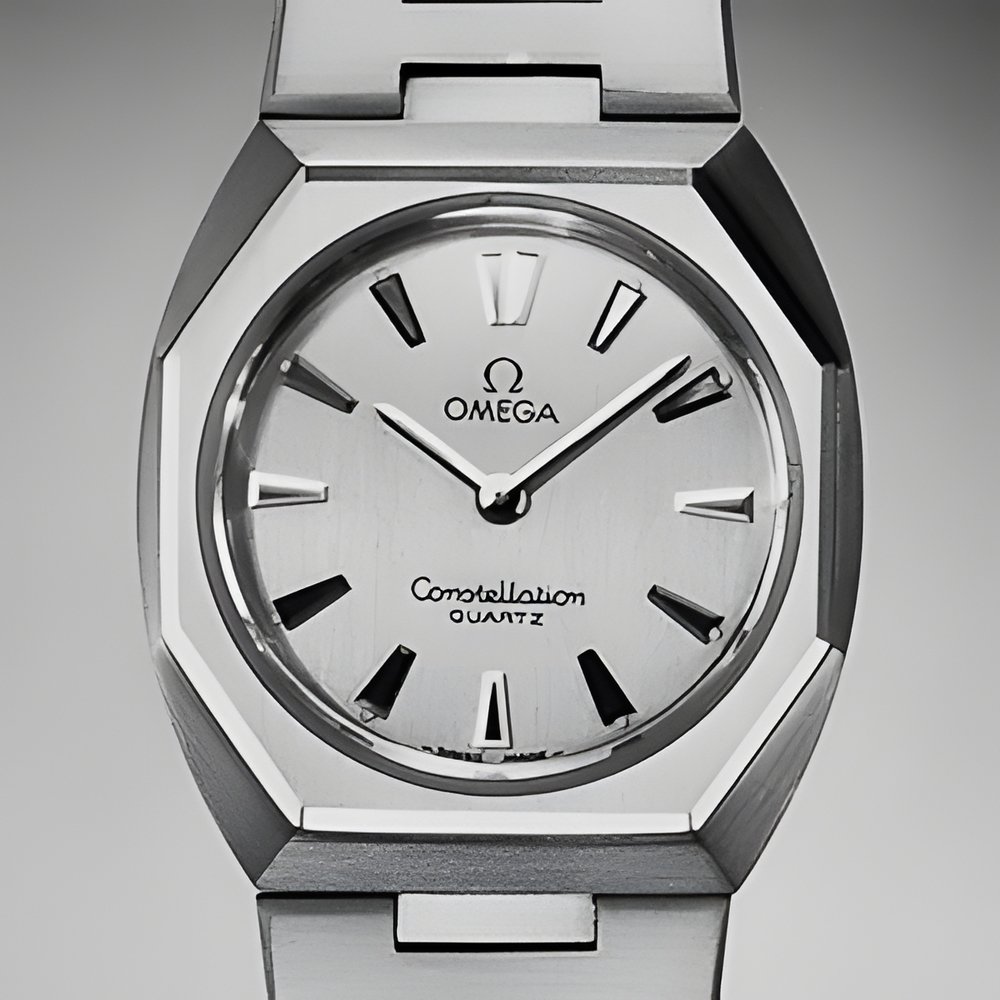 Two ladies’ watches whose water-resistant case protects a miniaturised quartz movement. Electronic time setting by a single pushpiece sunk into the case side. In steel, 18K gold or steel with 14K gold inlays. Diamondcut facetted bezel, scratch-resistant sapphire crystal. About 3 years’ reserve power. Registered models. (OMEGA Constellation Quartz)