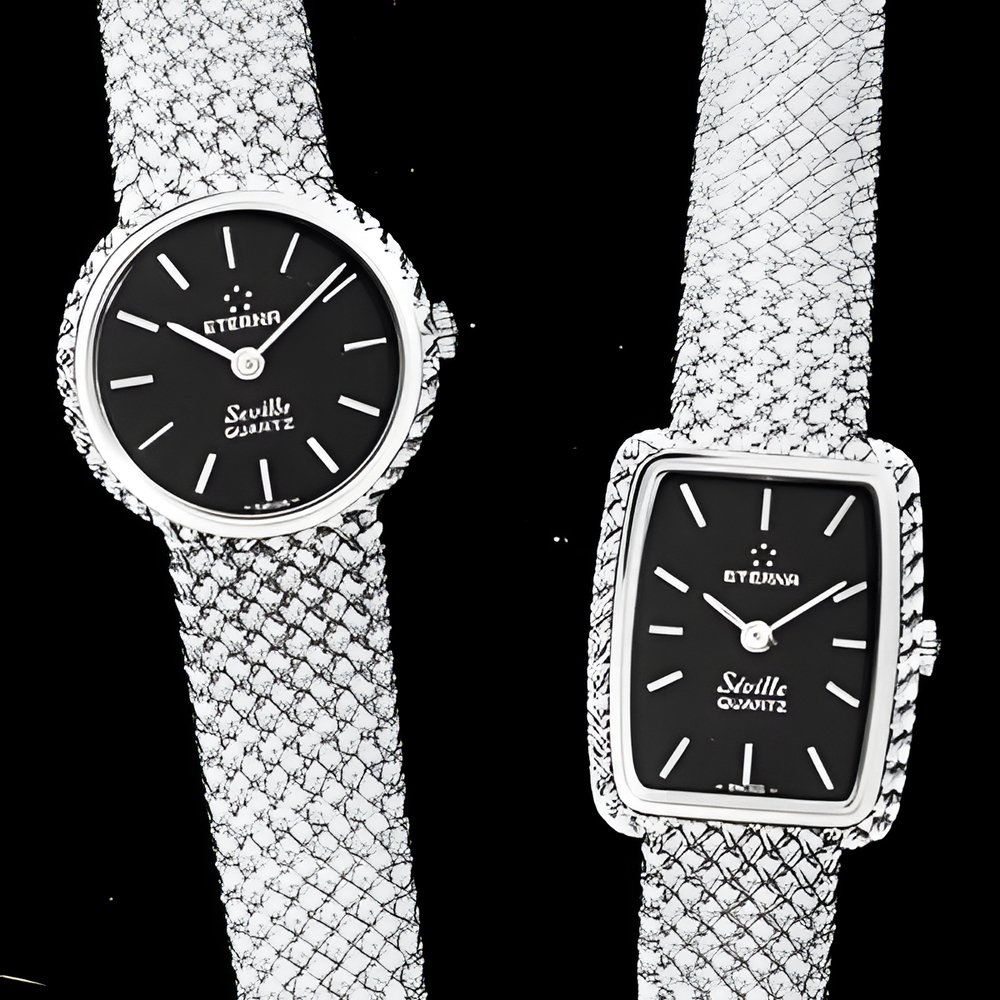 Two utterly fashionable Eterna designs featuring extra-thin quartz movements. Their gold-weave bracelets and their cases are entirely guillochéed by hand. Note the decorative work around the polished bezel. Matt black dial graced by gilt markers and protected by a sapphire crystal. In 18K yellow gold. (ETERNA Seville Quartz)