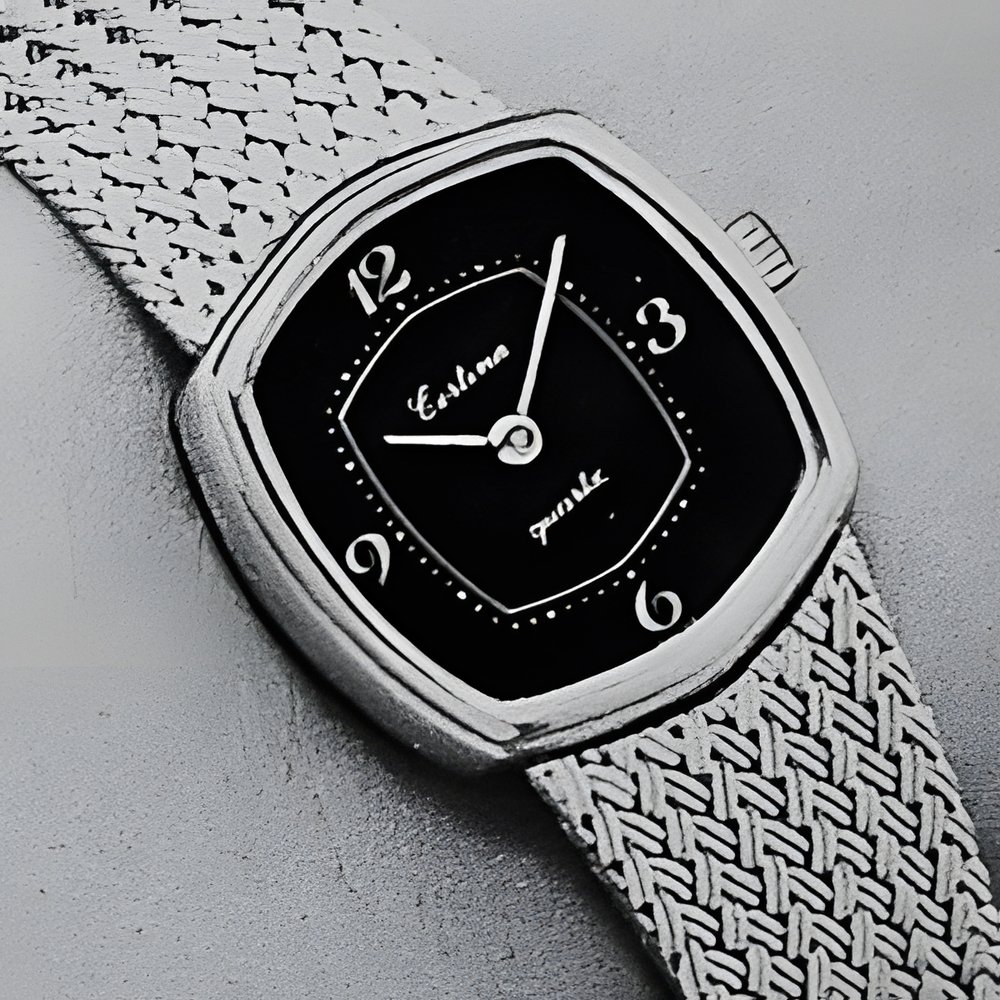 A graceful design from Certina’s new collection. Extra-slim case with subtly rounded lines, black dial with gilt Breguet numerals, integrated mesh bracelet. 10-micron goidpiate, mineral crystal and quartz movement. (CERTINA)
