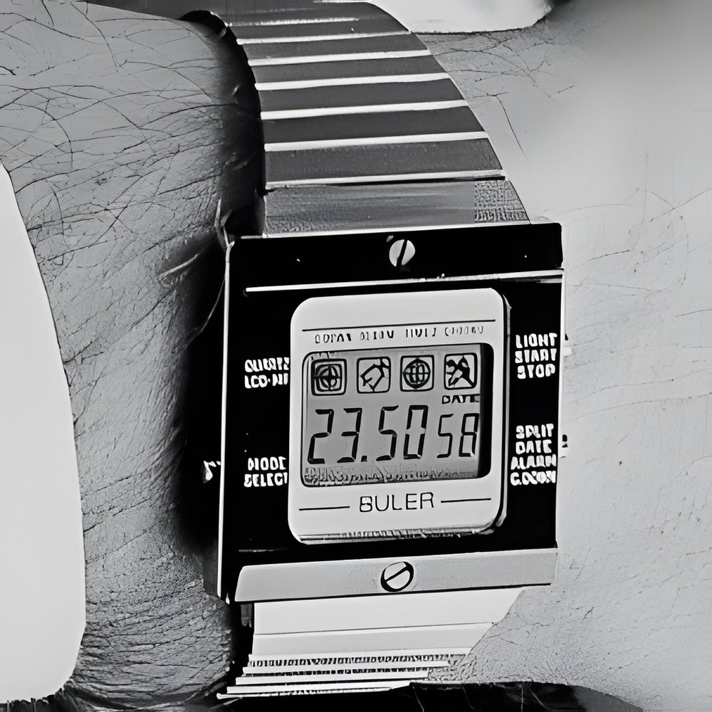 Buler’s latest quartz-piloted model with liquid crystal display (LCD) readout : chronograph functions to the 1/100th second, split time, countdown timer, alarm device and programmable second time zone. Readout of the selected function and simple operation. (BULER)