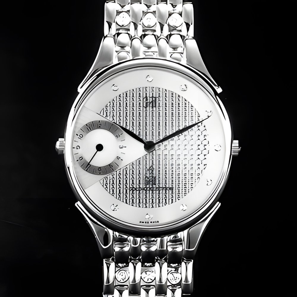 This GMT design provides the time in two timezones. It features a slightly oval-shaped 18K yellow gold case and an unusually supple link bracelet enhanced by small gold beads which can be set with diamonds. Its pattern is also found at the centre of the watch’s mother-of-pearl dial. With two quartz movements. (GMT Cold Collection “GMT by GMT”)