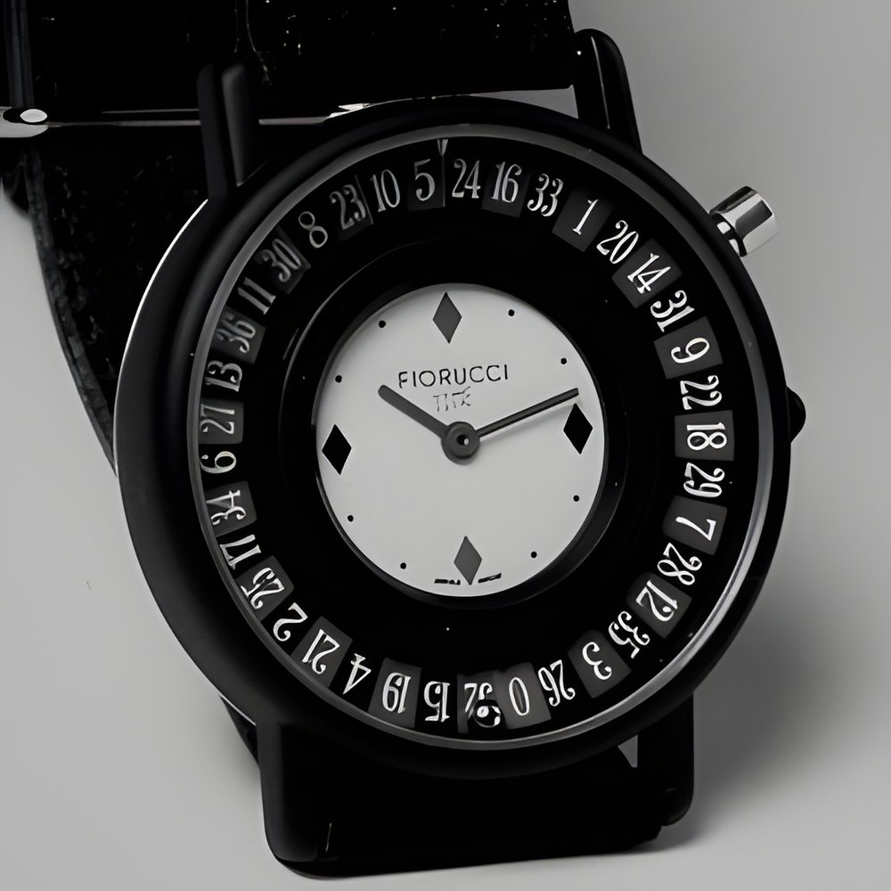 This is the first wristwatch ever to include a perfectly functional roulette mechanism (patent pending). When a pushpiece is pressed, the number wheel starts to spin and throws the roulette ball. Swissmade, water-resistant metal case housing a quartz movement. (FIORUCCI-TI:ME “Roulette” - Sosclan S.A., Lyss)