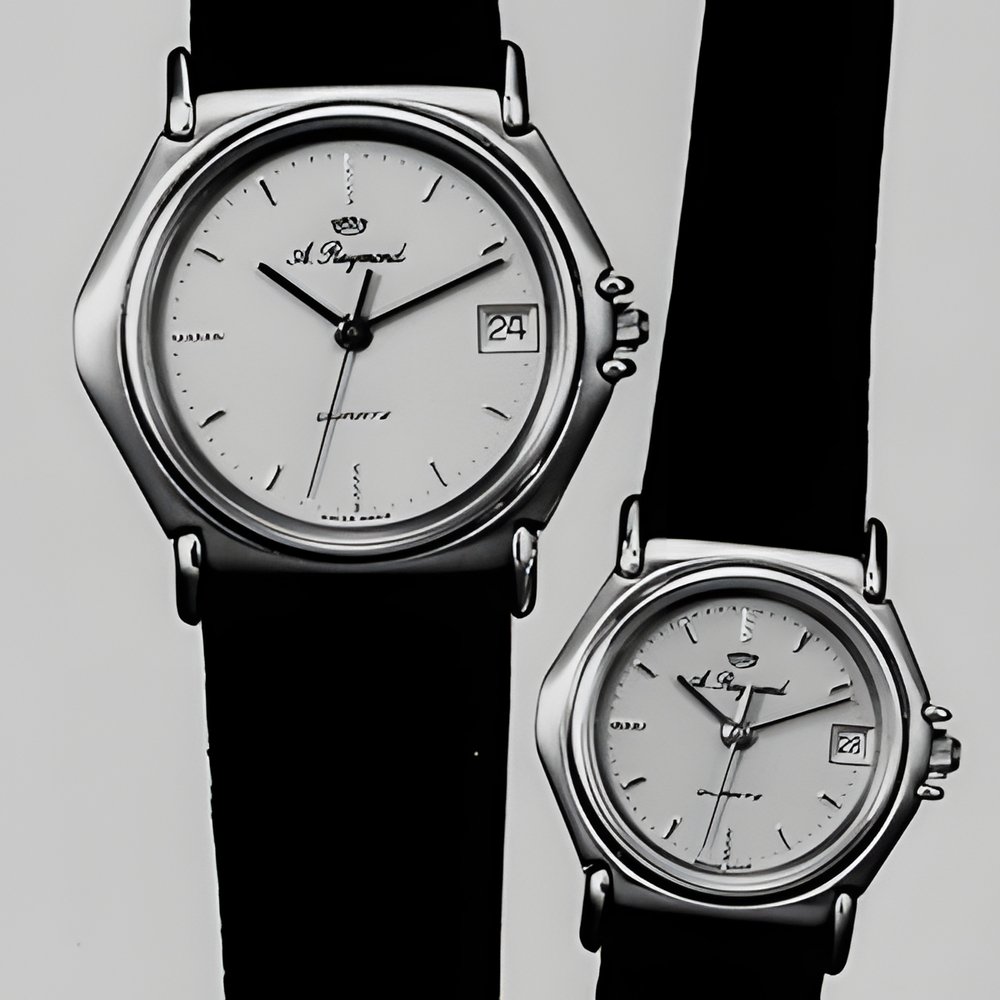 These A. Reymond quartz watches - with centre seconds and date - have subtle, elegant lines. Two-tone cases : rhodium-plated and goldplated, water-resistant to 3 atmospheres, mineral crystal. The “claws” are not only ornamental, they also ensure the protection of the crown. (A. REYMOND - J. Choffat S.A.)