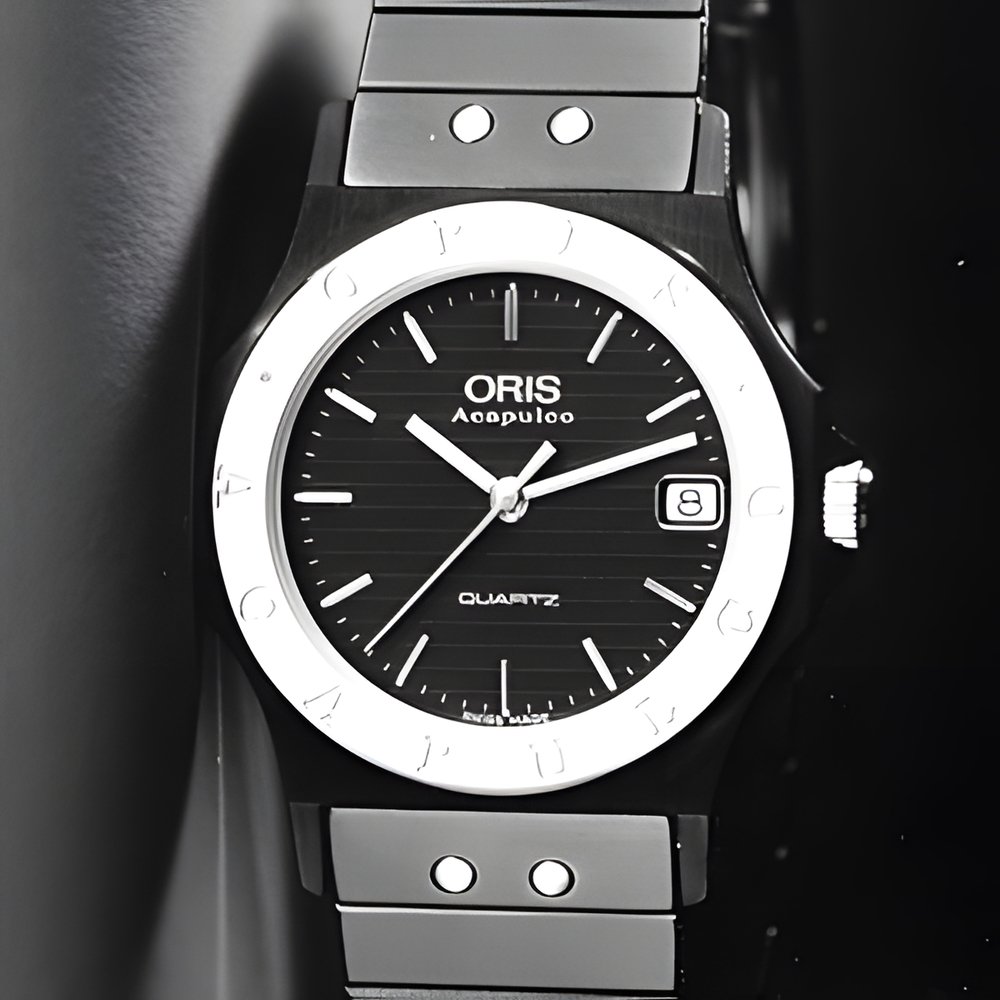 A layer of titanium carbide coating the steel base not only provides protection against scratches but also gives the case and bracelet a smoke-grey tone which enhances the sporty look of this quartz watch watertight to a depth of 50 metres. Power reserve : 31/2 years. (ORIS “Acapulco”)