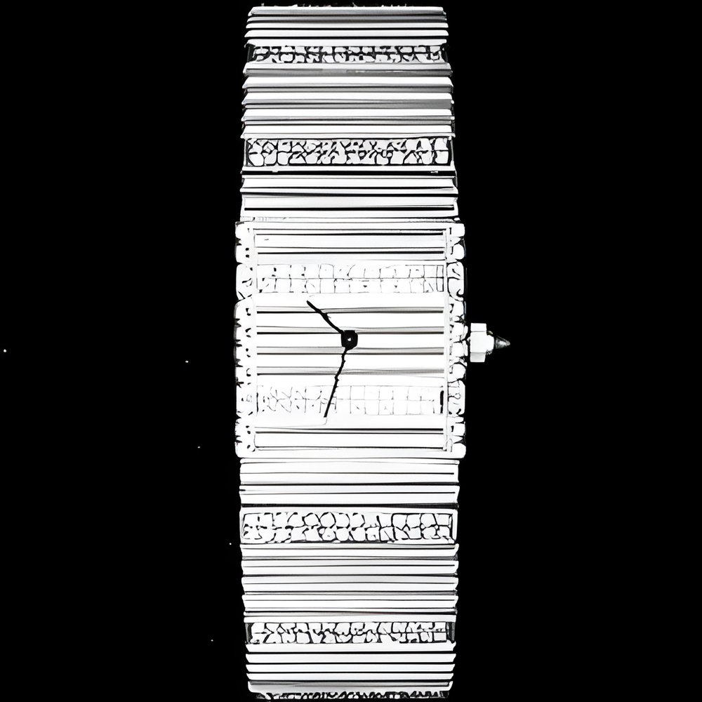 The ’Tube" line, very popular today, is also available in a jewellery configuration, as evidenced by this Léonard design in 18K yellow gold (138 g of gold), set with 372 full-cut diamonds (3.08 carats). It features a very flexible bracelet whose decorative pattern extends to the dial. (LEONARD)