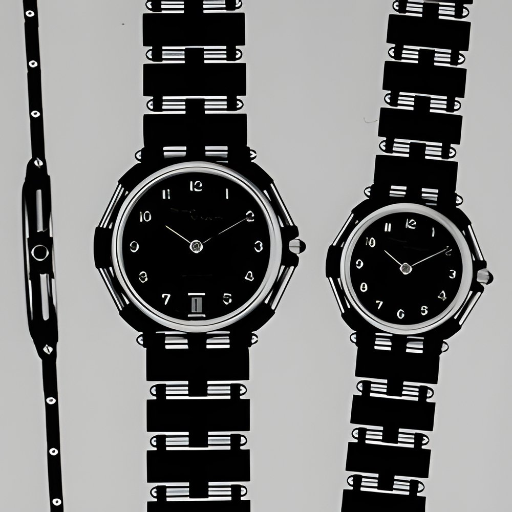 Total thickness of the new Mougin & Piquard models: less than 5 mm. Cases water-resistant to 3 atmospheres, with the famous tubular motif, finished in black chromium and 10 micron gold-plate, 18K gold bezels. Dials are black or mother of pearl. ETA Flatline III quartz movements.