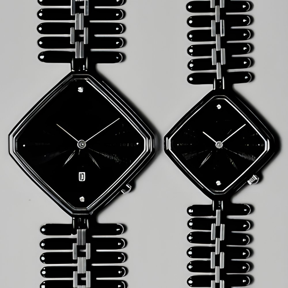 A new line : diamond-shaped watches. These new Ardath designs are fitted with ultra-thin ETA Swiss quartz movements. Waterresistant cases in goldplate. Very flexible bracelets composed of tiny metal tubes. Sapphire crystals. Dials set with zircons. (ARDATH, Geneva)