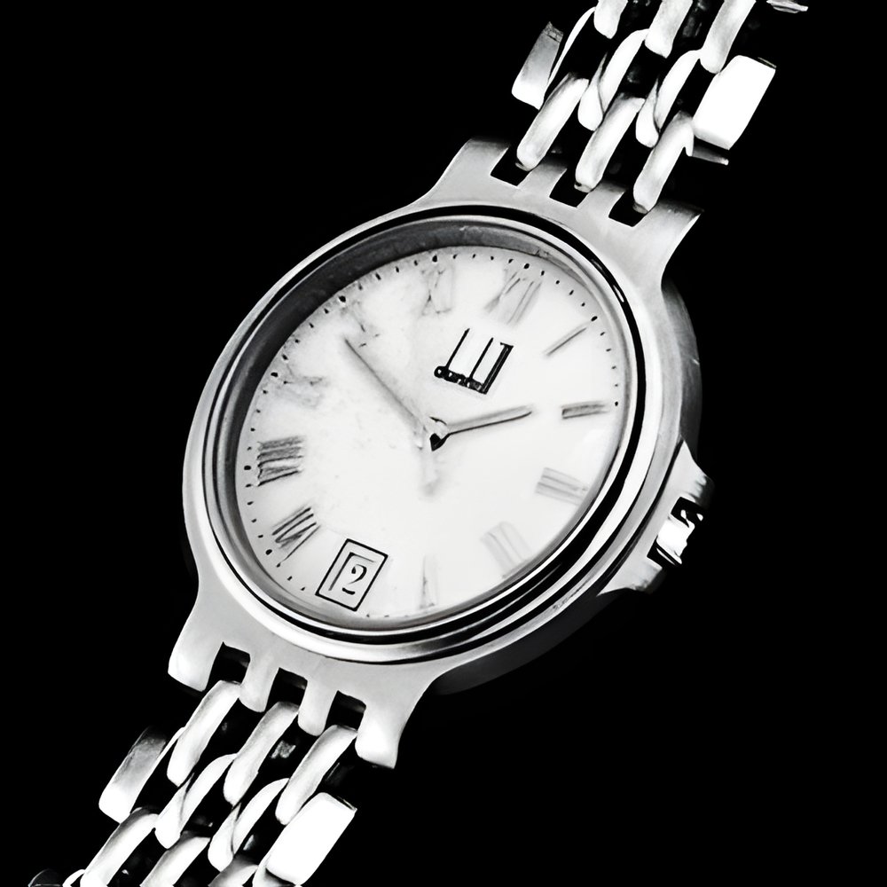 A newcomer : the Dunhill Millennium “Elite”. Open, flexible 18K gold and steel bracelet affords greater comfort to the wearer by allowing the skin to breathe, ideal in hot weather and tropical climates. It features a slimmer movement and its elegance is enhanced by skillfully applied gold numerals. (DUNHILL Millennium “Elite”)