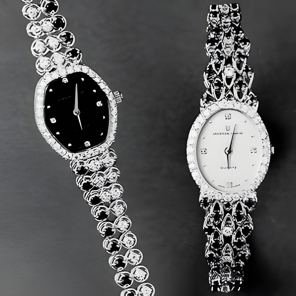 Fitted with miniaturized quartz movements, these small “rivière” type watches feature rubies and sapphires mounted in 18K yellow gold. (UNIVERSAL GENEVE)