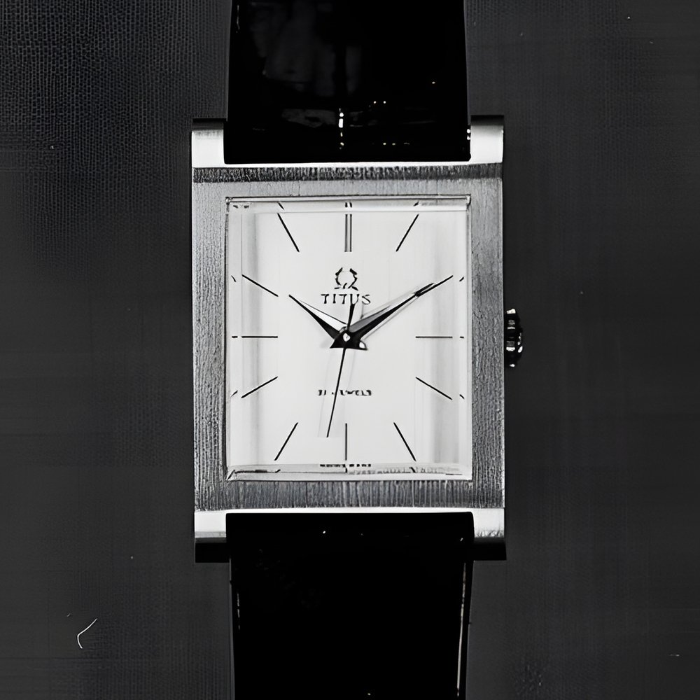 Man’ s watch with classic lines, highly formal. The extra-slim case is in steel, with a brushed finish. The dial is faintly grey with the same tone as the case. Index markers painted black. (SOLVIL & TITUS)