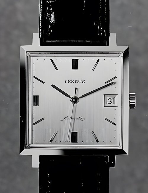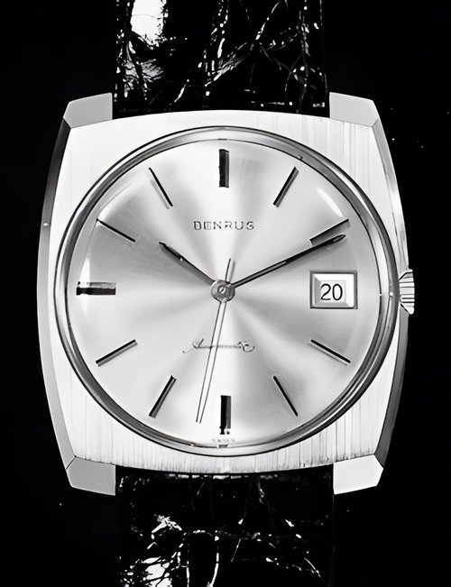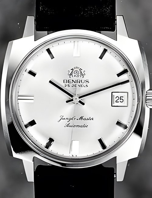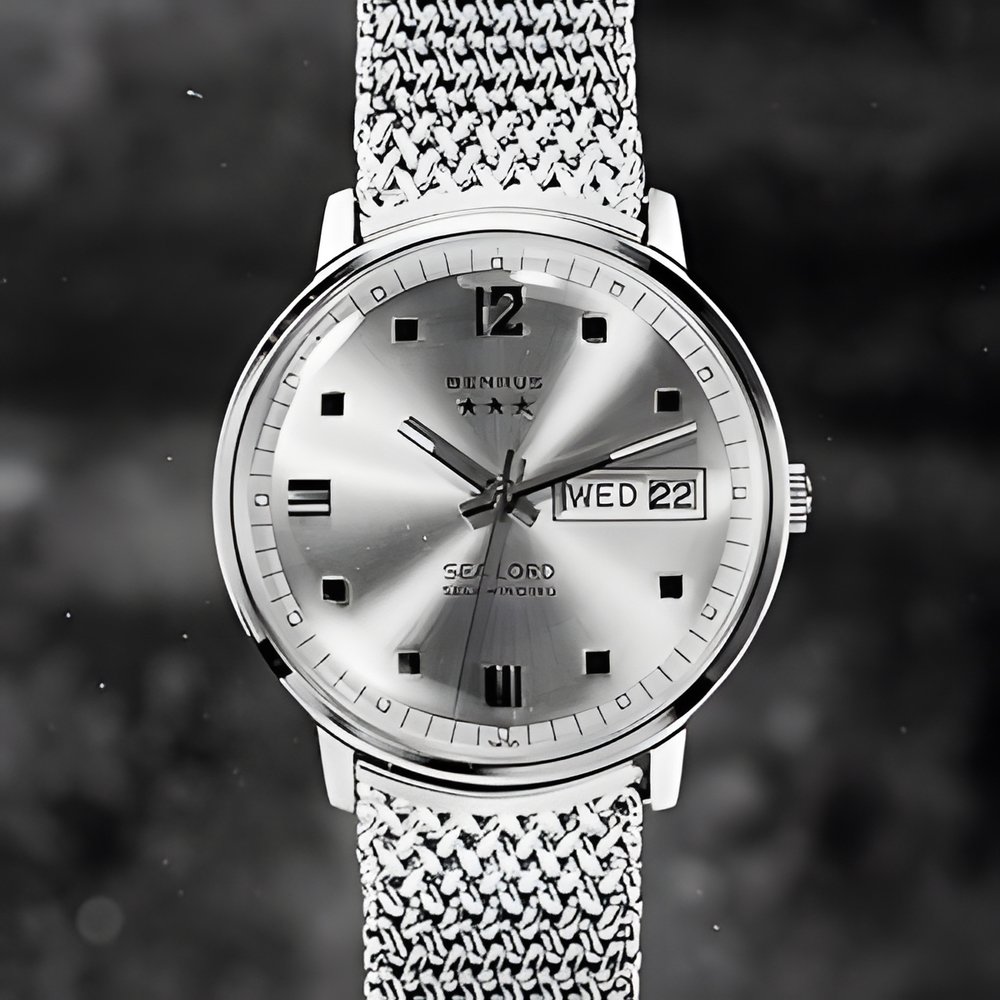 This man model is named “Sea Lord”. Its waterproof case is a monocoque construction. Narrow surround gives emphasis to the fullness of the dial. Self-winding movement, with calendar showing date and day in the same opening. Note the special importance given to the markers, which are in high relief. Metal bracelet. (BENRUS “Sea Lord”)