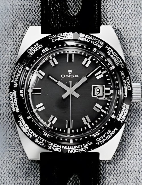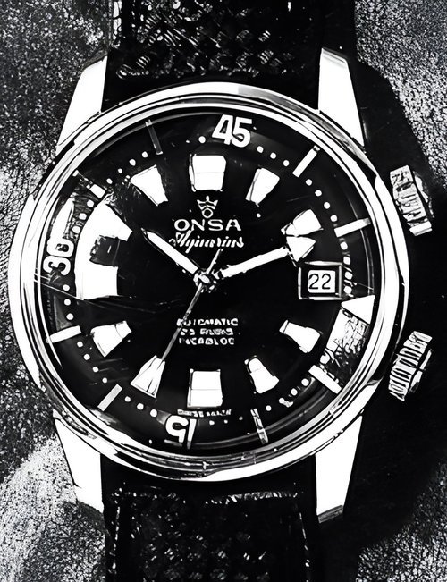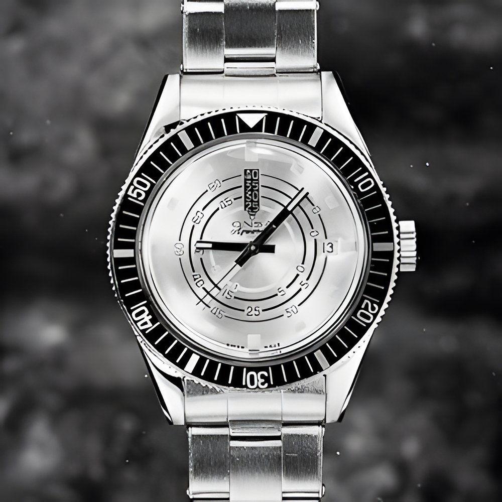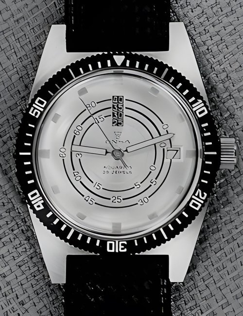 A new, highly efficient watch for underwater use. It is fully waterproof, all-steel case is guaranteed to a pressure of 20 atmospheres (600 feet), with a turning bezel for elapsed time readings. The dial carries a decompression table enabling the diver to calculate with ease the various stages of his return to the surface. (ONSA)