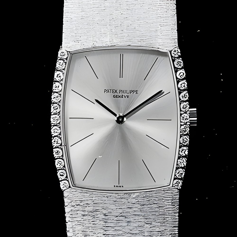 A discret, exceptionally iuxuriow nc; man’s dress watch. The bracelet is in 18 ct. white gold and the case studded with brilliants. Here the new "Belle Epoque’ style makes itself felt through the oval dial - cut off at each end - and the enamel hour markers. (PATEK PHILIPPE)