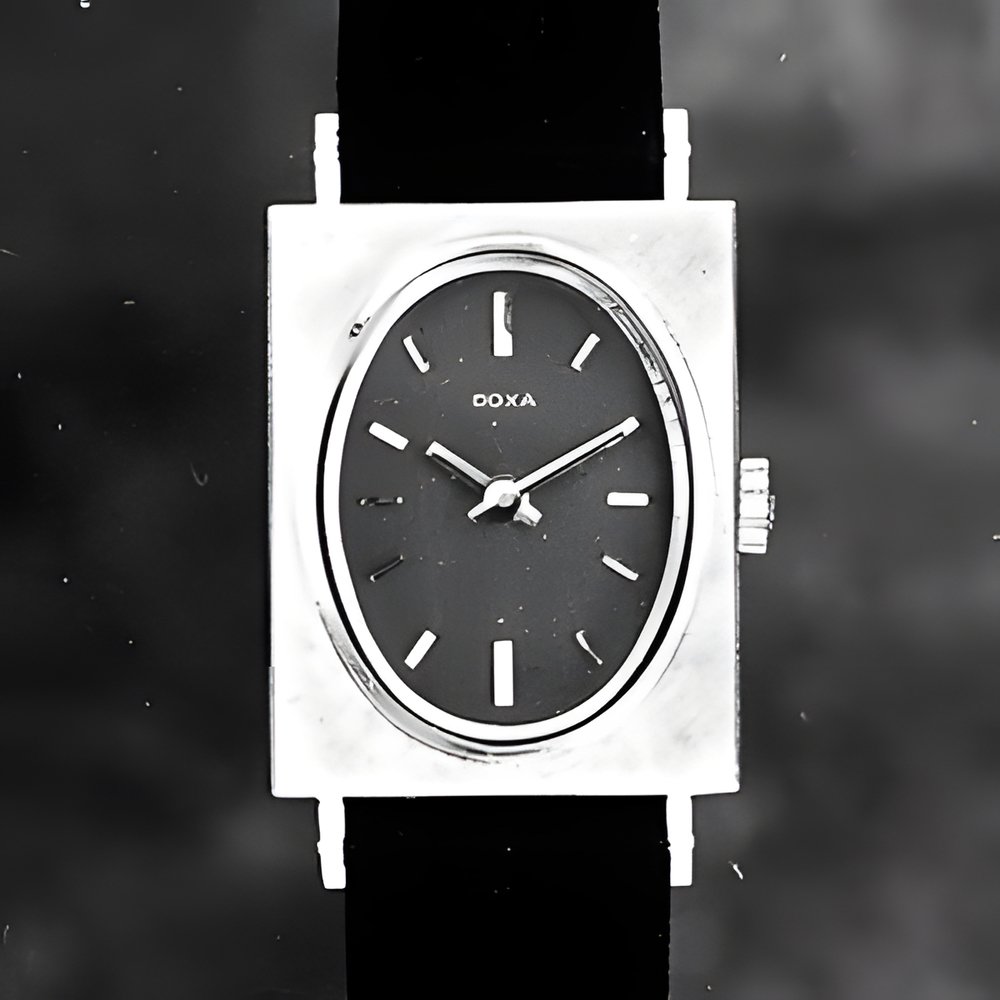 The oval dial opening of this elegant ladies watch in 18 ct. gold is very much in the current Swiss styling vogue. The dial is in satin blue, with applied gold hour markers. (DOXA)
