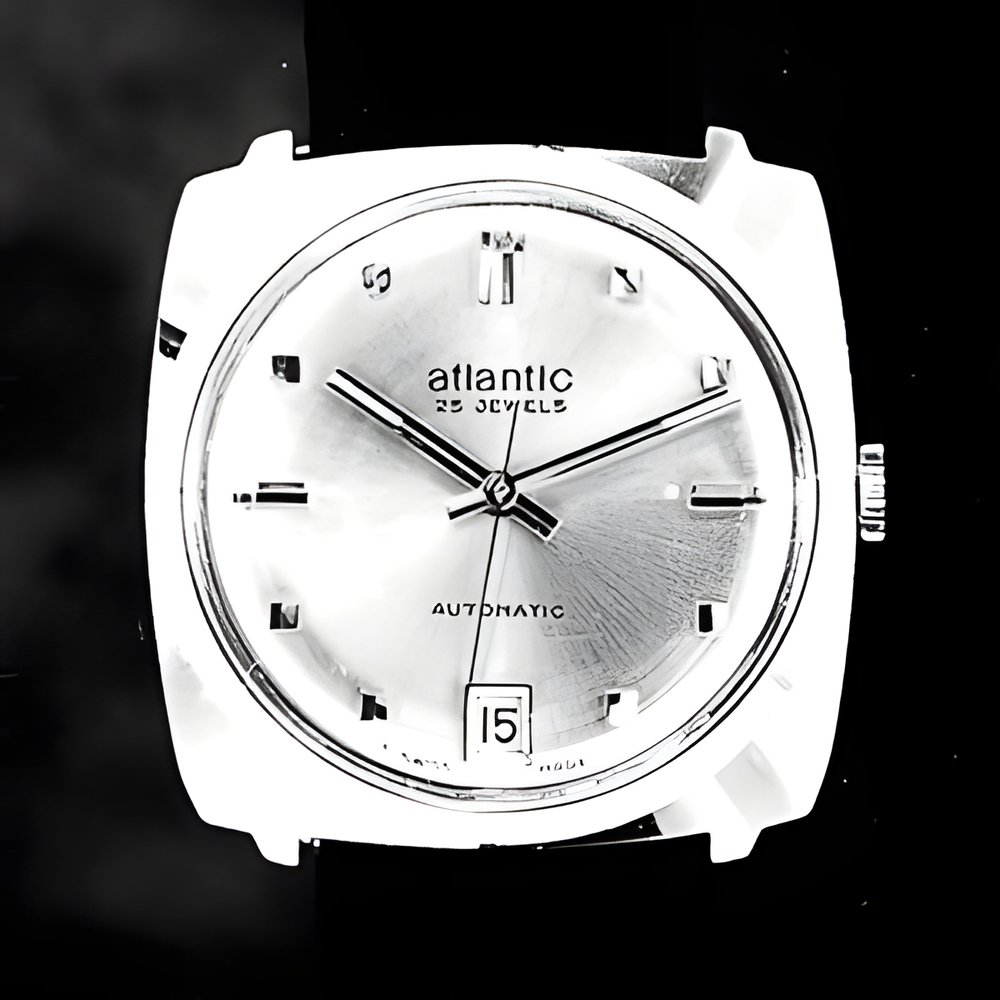 An extra-flat automatic movement powers this handsome “soft look” styled man’s watch. The waterproof case comes in gold plate or chrome (always with a steel back). Note the positioning of the date calendar window : in the six o’clock position. (ATLANTIC “Downtown”)