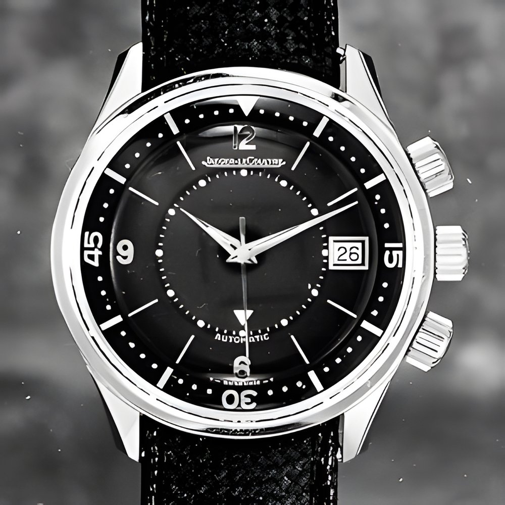 The “Iviemovox” watch - fully automatic, with date calendar and alarm - is here presented in the form of a diving watch. It has an all-steel case, waterproof to 20 atmospheres - 600 feet depth - and an inside turning bezel. (JAEGER- LECOULTRE)