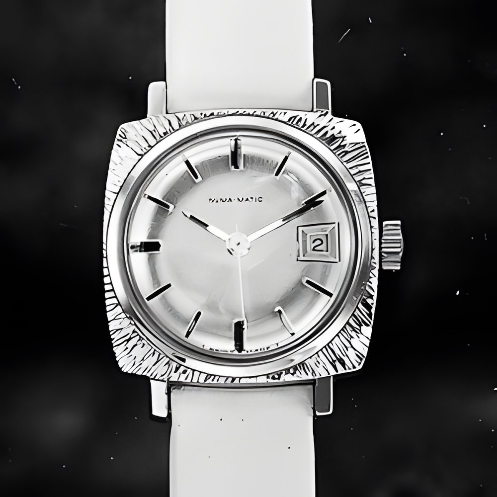 The enormous demand provoked by the date calendar feature for men’s watches has led inevitably to its adoption on women’s models. This newcomer has an automatic movement, a centre mounted second hand and a fully waterproof, finely chiselled case, gold plated. (NUMA - MATIC)