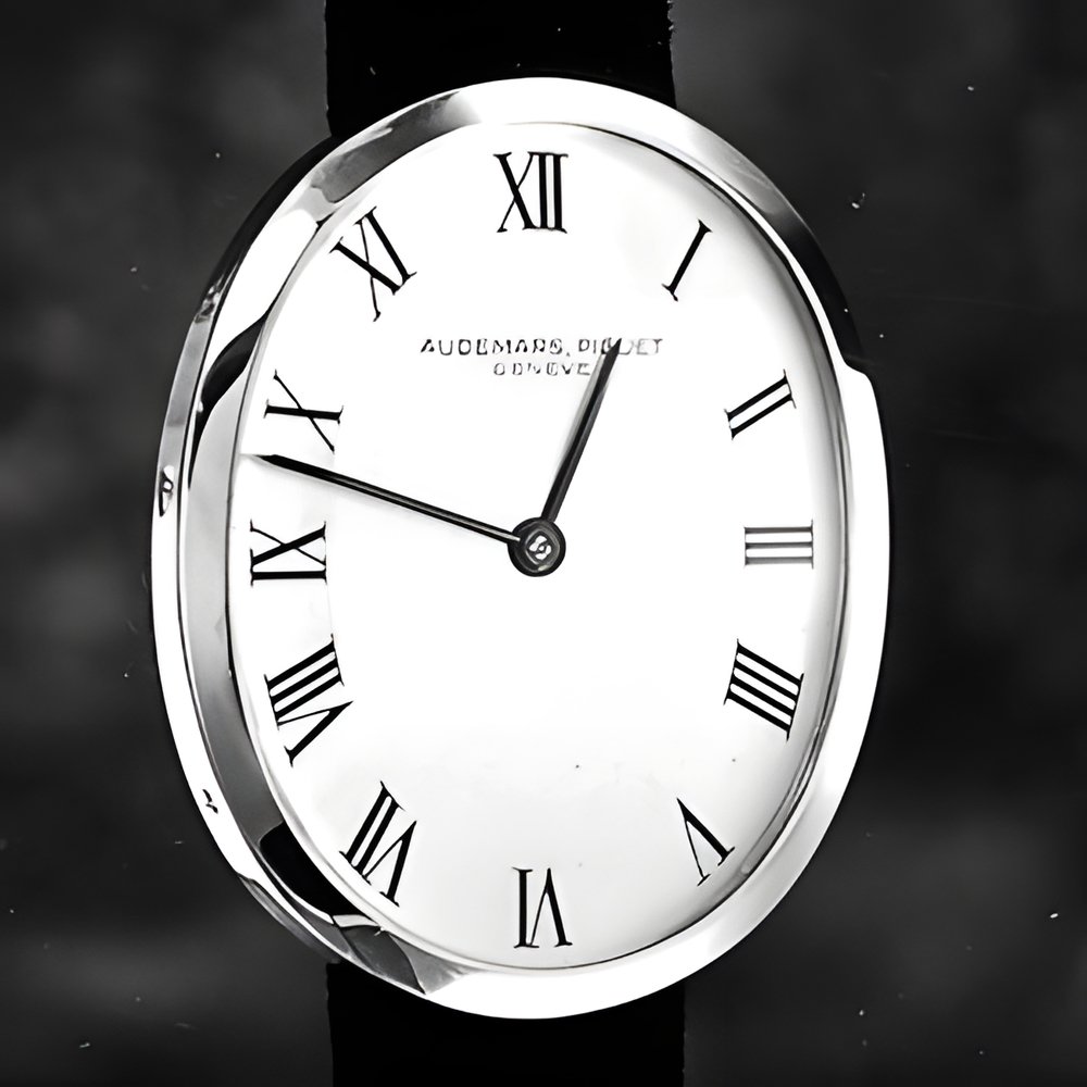 A perfect example of the “Belle Epoque” (early 1900 s) styling theme sweeping all before it in Swiss watch design this year. On show at the Swiss Watch Fair, this superb creation has an extra-flat large oval case in 18 ct. gold, set off by a silvered dial with Roman figures. The purity of the line of the watch is completed by the systern by which it is fixed to its bracelet - under the case. (AUDEMARS PIGUET)