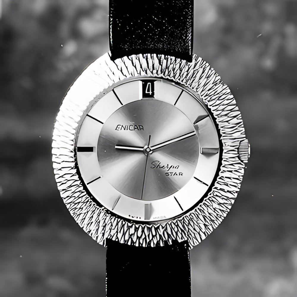 Way-out styling in the modern Swiss idiom for this new man ’ s wristwatch. Its large bezel is worked in the “native gold” rough finished - style in 18 ot gold. For contrast, the dial surface is highly polished. Note too the placement of the date calendar window at 12 o clock and the highly original way of fixing the bracelet, with no lugs The sunken winding stem adds a final subtle touch to the lines of this unusual creation. (ENICAR “Sherpa-Star”)