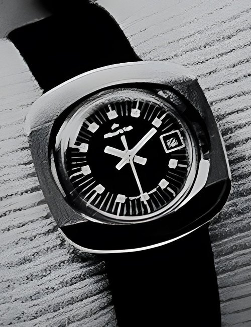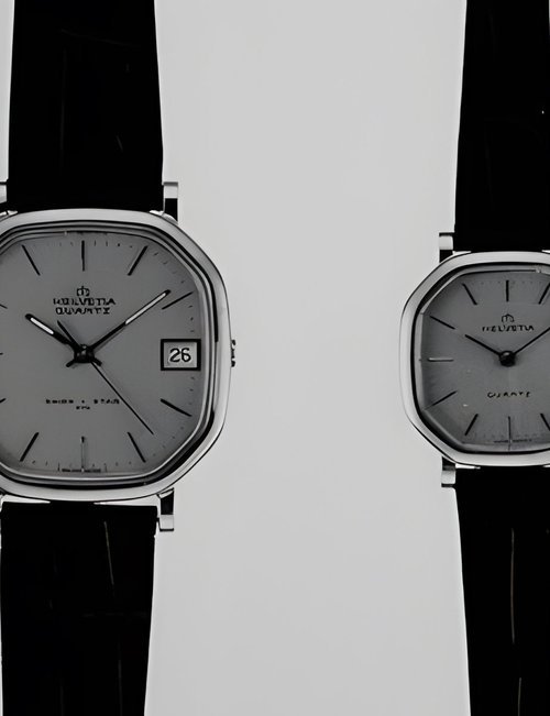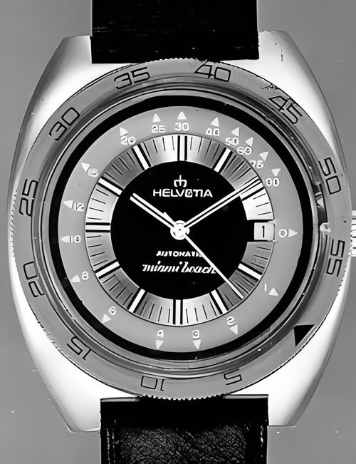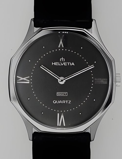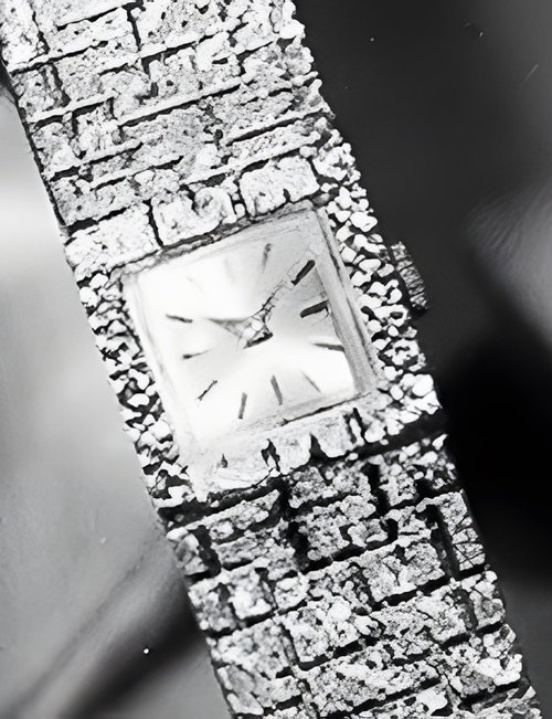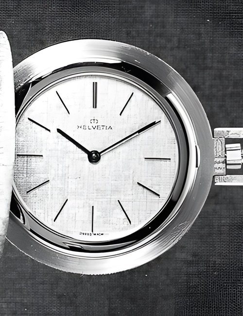 There’s a classic feeling about this new ladies’ watch, The gentile curves of the outside case lines give the fashionable modern touch to its feminine appeal. The dial, heavily chiselled blends beautifully with the extra wide bracelet with its large links In 18ct gold. (HELVETIA)