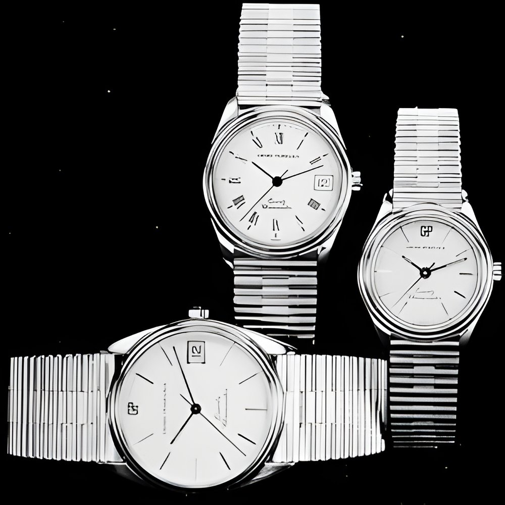 A new line of Quartz Chronometers by Girard-Perregaux. These timepieces, all individually tested by an impartial and official body, are made in three different sizes. Water-resistant cases, twin-ring bezel, two-tone styling in 14K gold and stainless steel. Note their extremely supple bracelet composed of tiny juxtaposed tubular elements. (GIRARD-PERREGAUX “Official Quartz Chronometers”)