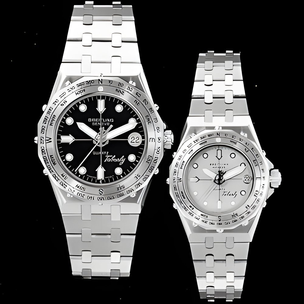 “Super-sports” watches for sailing or diving. All-steel cases, water-resistant to a depth of 200 m, mineral crystal, screw-lock crown. Click-equipped bezels with course or wind-direction indicator or else with time data for diving. Very large and legible hands and luminous dial indications. Quartz movement with centre seconds and date calendar. (BREITLING GENEVE - "Tabarly)