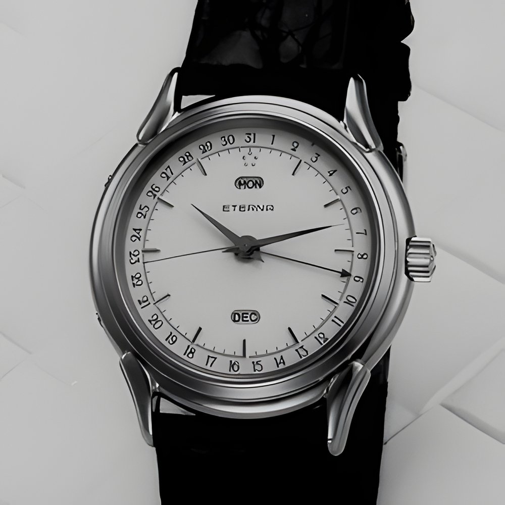 Eterna’s “Historique” design is making history this year. Built around a multiple-function mechanical movement first introduced in 1946, it shows the hours, minutes, date (with a pointer), day and month. Each movement, made in 1946, has been carefully reconditioned in the interest of collectors. Production is limited to 100 units, each individually numbered. Internationally registered model. (ETERNA “Historique”)