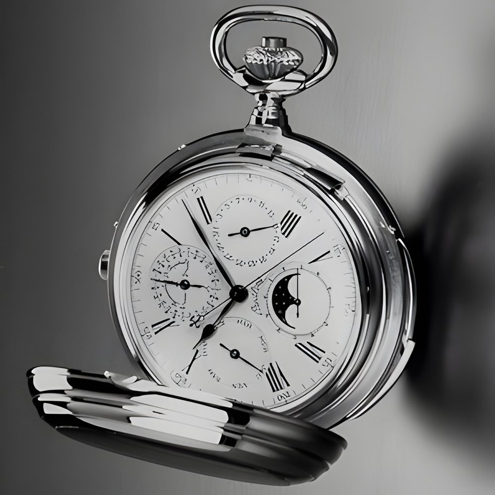 A collector’s dream watch : this hunter-type timepiece in 18K pink gold with two coverlids houses a complex movement in the grand tradition feattiring a minute repeater, a chronograph and a perpetual calendar. Superbly finished, it comprises some 1,300 parts, circular-grained, chamfered and polished. Century-old movement blank from the Vallée de Joux, 18,800 v.p.h., 33 jewels, bimetallic or Glucydur balance wheel and handmade gongs. (BREITLING)