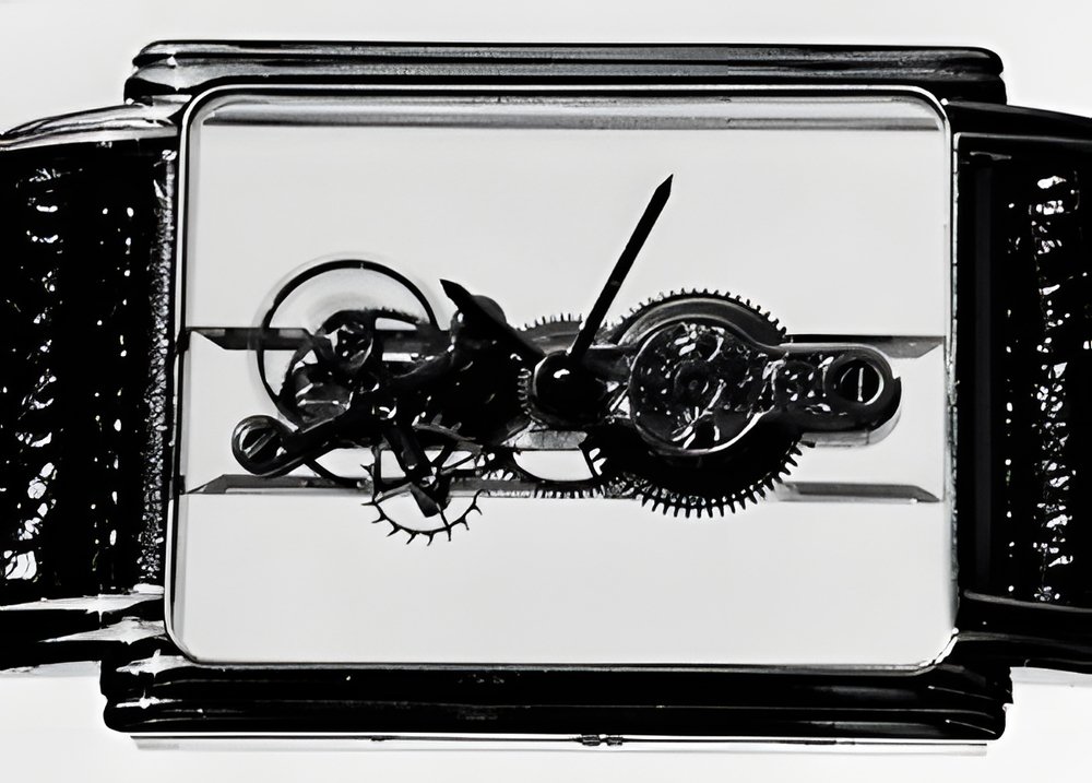 Probably the smallest “flying” tourbillon ever made. In this type of tourbillon movement, the mobile cage in 18K gold carrying the escapement parts is pivoted on its lower part only. Total volume is equivalent to a 4 1/2-line baguette calibre. (VINCENT CALABRESE, Lausanne)