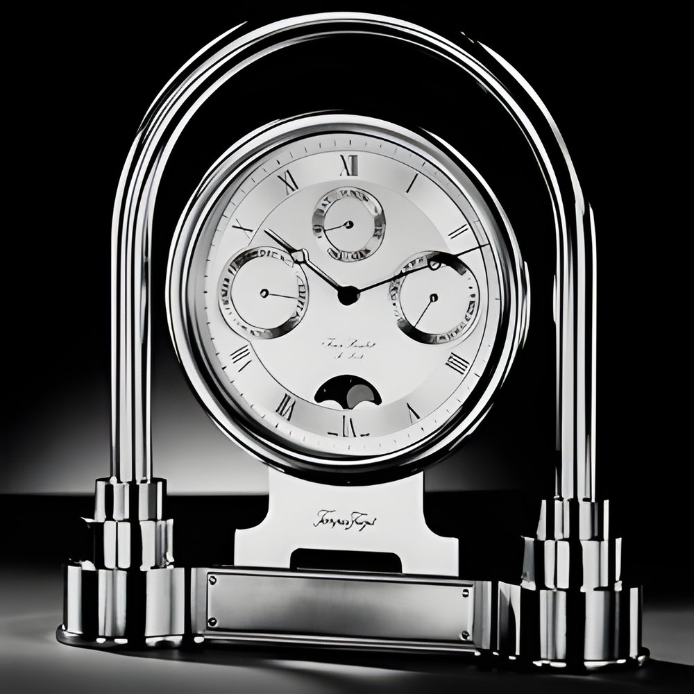 A blend of the classic and the modern, this clock shows the date, the day, the month and the phases of the moon. Silver-plated dial, gilt solid brass case (size : 210 x 220 mm) with wrought decorative features, inside a polished arch. Quartz movement. (JEAN ROULET “Argeles”)
