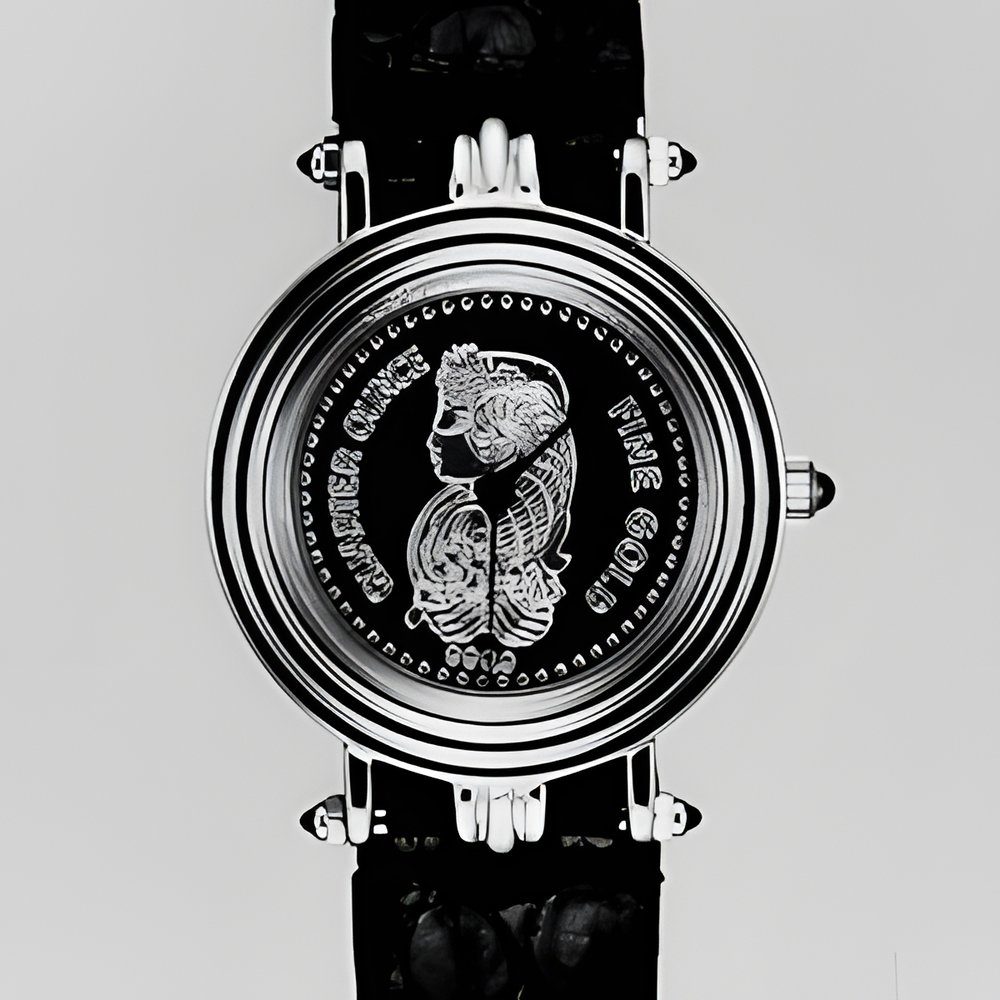 From the new “Tesoro” collection developed by Pamp S.A., Geneva, together with the renowned Swiss watchmakers Chopard & Cie S.A., Geneva, this men’s gold watch has a dial made of a 24 carat gold coin. Quartz movement, water-resistant case, crocodile bracelet. (PAMP S.A., Geneva)