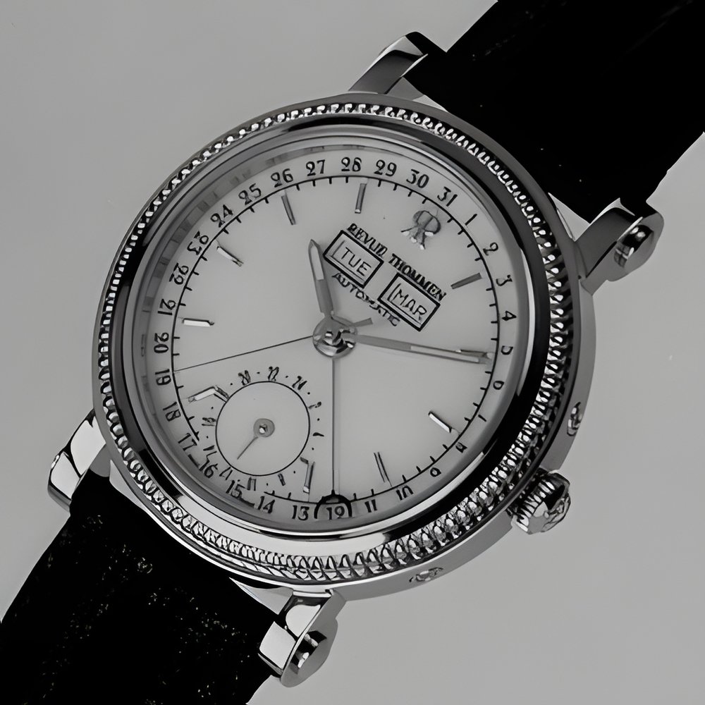 Selfwinding mechanical watch with complex auxiliary mechanisms. Along with the time, it features a full calendar with date shown by means of a pointer and the days and months in separate apertures. A subdial located at 6 o’clock provides the time of a second timezone on a 24-hour dial. Goldplated case with beaded, stepped bezel. (REVUE THOMMEN)