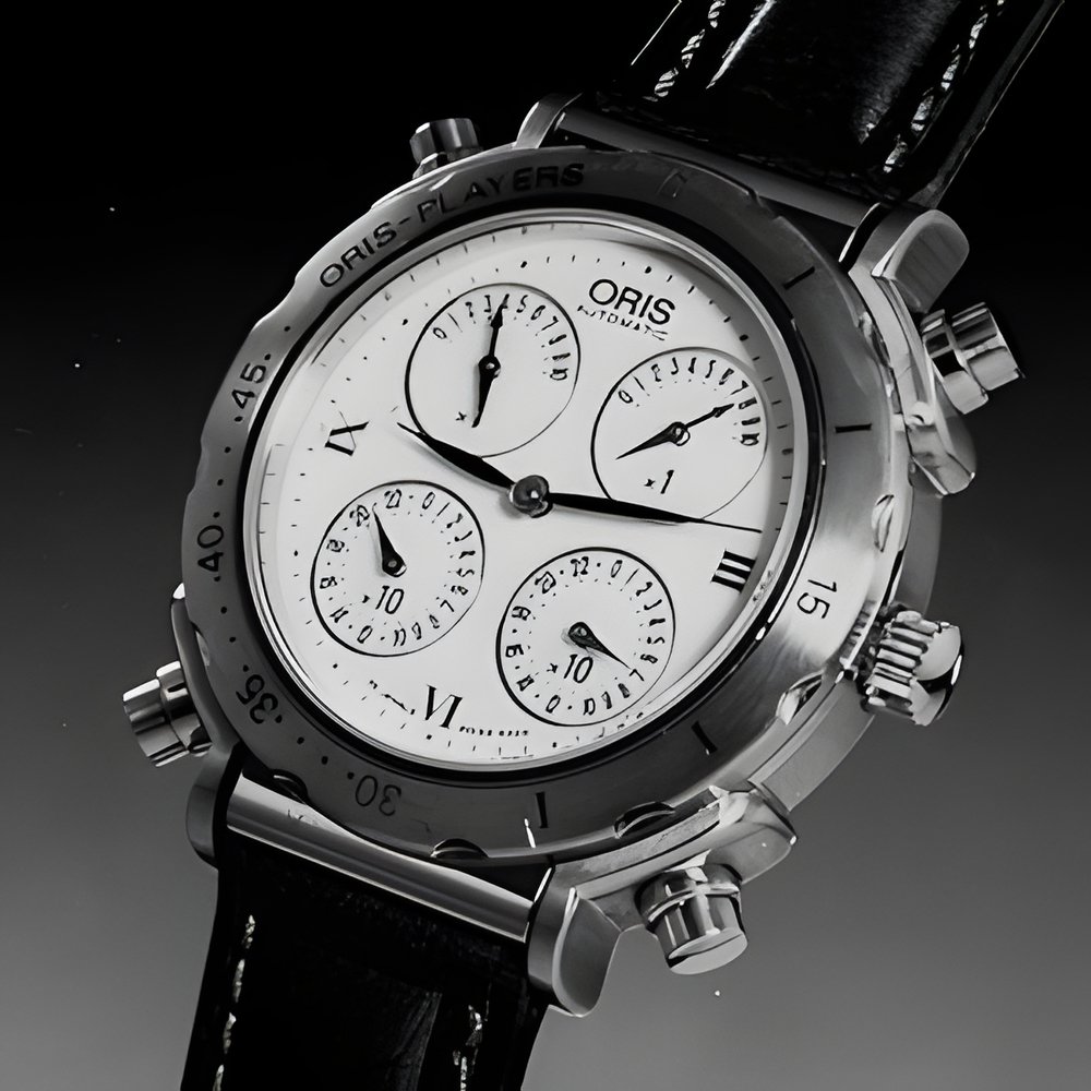 This Oris “Players” wristwatch is a seifwinding mechanical timepiece with memory capacity. It features four independent totalizers that can be used to record all sorts of things : two players’ golf game, for instance, or basketball faults, rowers’ stroke rate per minute or even how many cigarettes you smoke a day. The two totalizers at top can count up to lo points of any event, the ones at bottom from O to 23, while multiplication by 10 allows you to memorize up to 230 points on either of them. With fast-action return to zero and a rotating bezel for time checks. ETA 2824-2, 25-jewel selfwinding movement. All-steel water-resistant case. (ORTS “Players”)