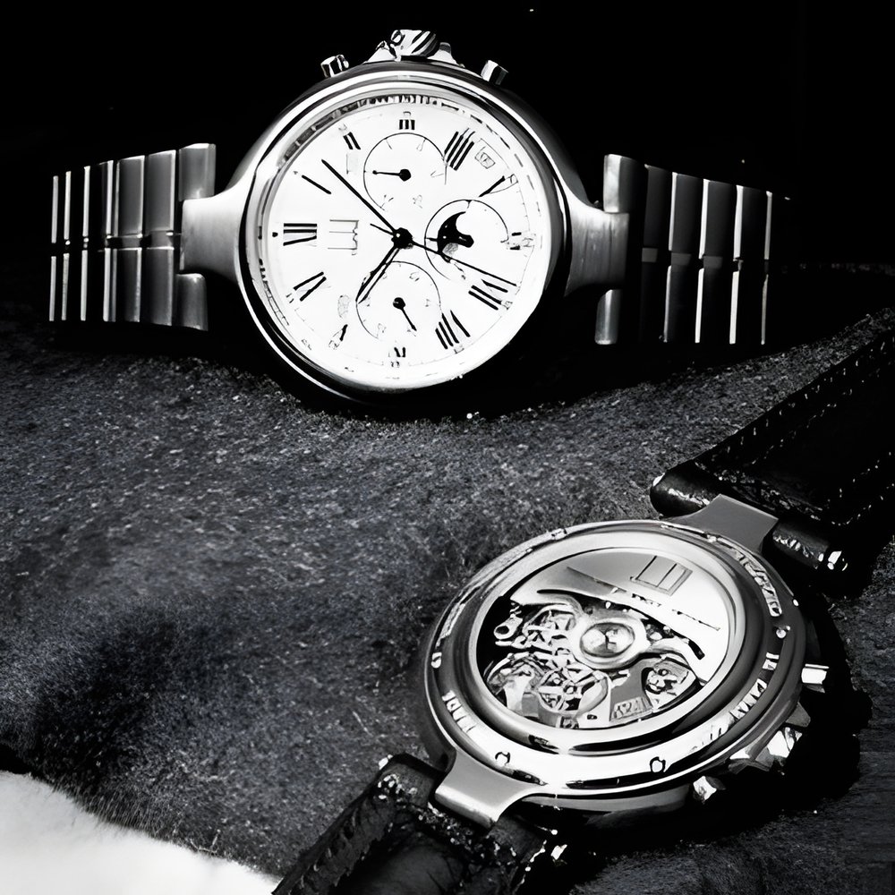 The Dunhill chronographs : stylish and sophisticated dials display day, date and phases of the moon. Functions include stop watch, sweep second, 30-minute and 12-hour recorders and tachometer ratings around the dial facilitate speed calculations. Sapphire glass backs reveal the finest Swiss automatic movements. (DUNHILL)