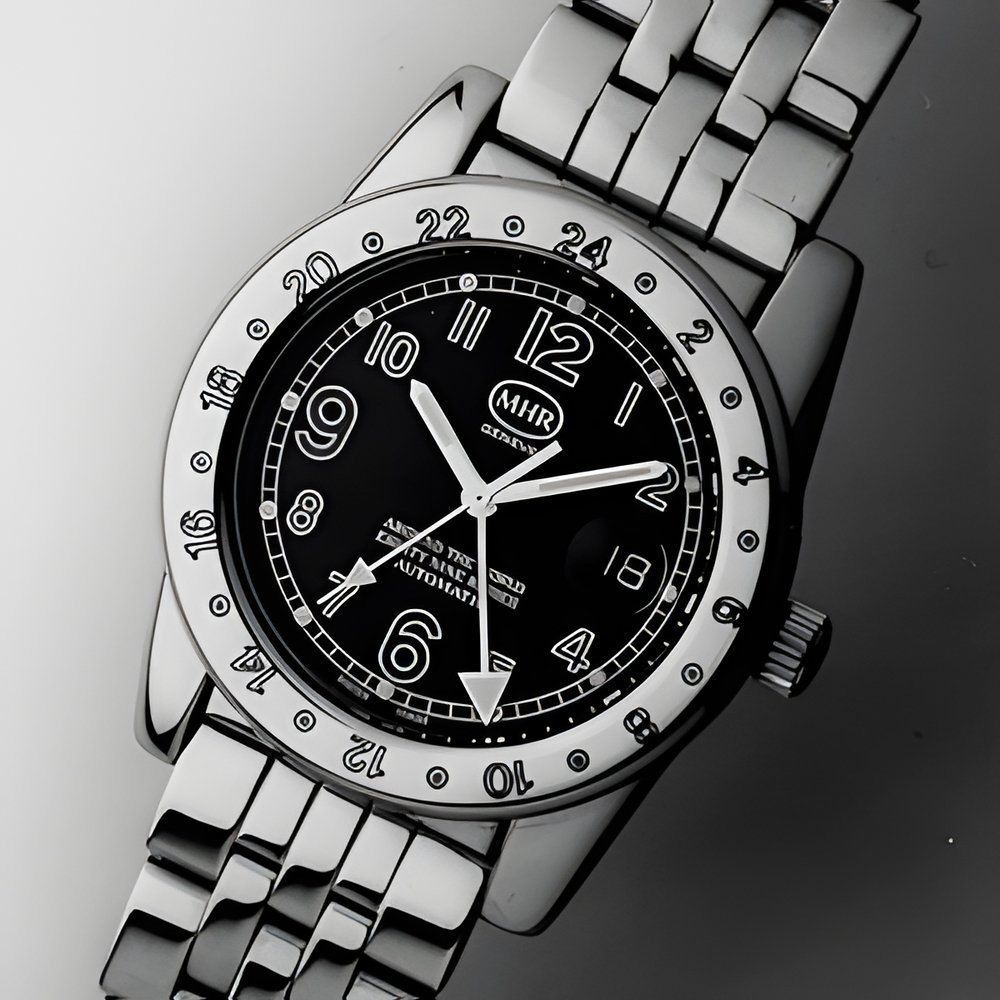 This MHR “24 Hours Around the World” wristwatch is fitted with a 10 1/2-line GMT (2nd timezone) Frederic Piguet 9516 selfwinding movement, with date calender. Case water-resistant to 30 m with threaded case back, screw-lock crown and one-way counterclockwise notched rotating bezel. Designed in 1989, as indicated on the prototype’s dial. Available in 18K gold or steel and gold, with matching bracelet. (MAHARA MHR MONTRES S.A., Geneva)