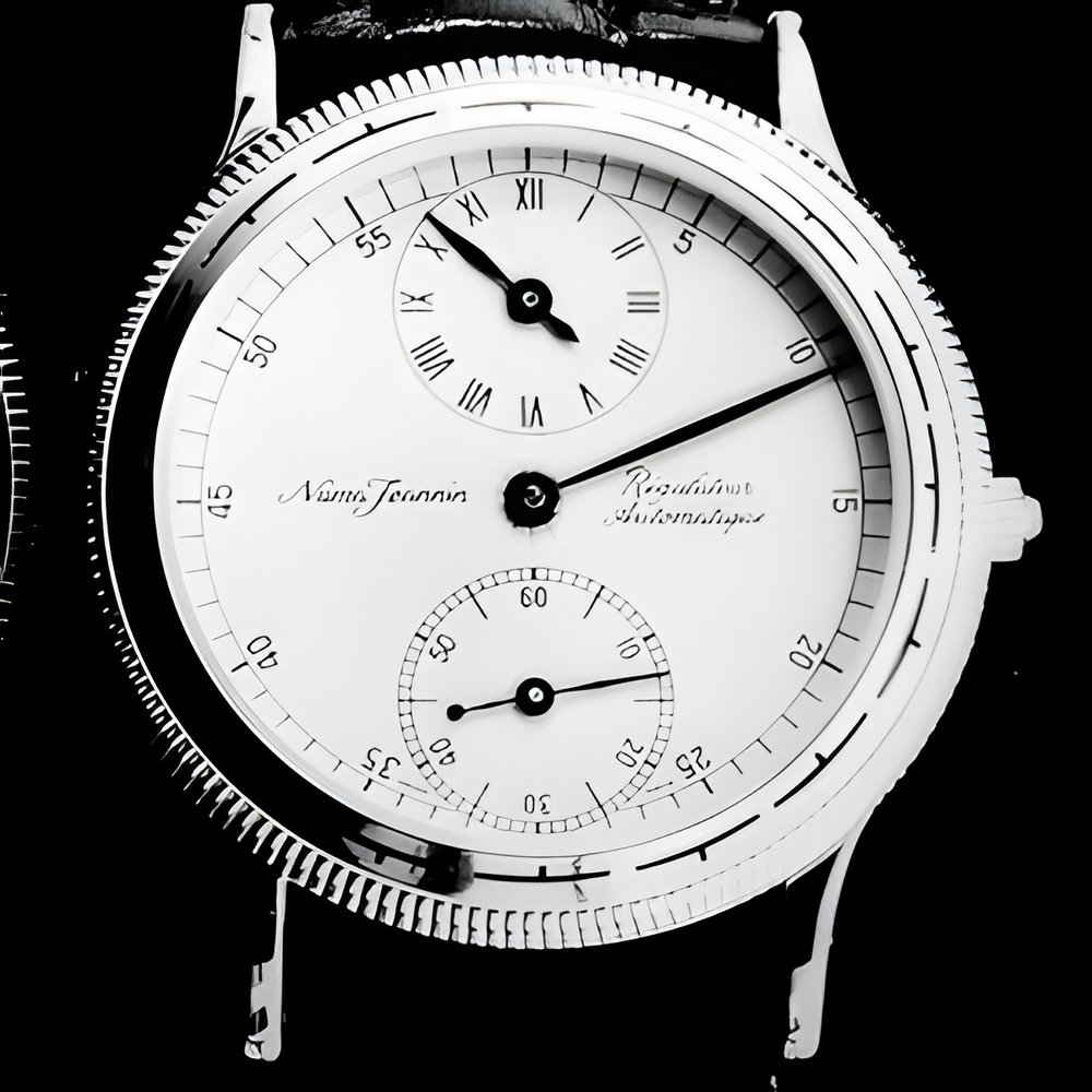 This model features a case that exactly replicates that of one of the first selfwinding writswatches designed by John Harwood in 1926. Even the most critical observer will not fail to appreciate the quality of its 10-micron goldplate, its bezel decor’s stylish lacquer inserts and the flawlessly limpid scratch-resistant sapphire crystal. The case’s transparent, mineral-glass back reveals the intricate workings of an accurate seifwinding movement of recent design, assembled and decorated by experienced craft watchmakers. The time is shown by means of a special mechanism that features three independent hands, in the style of the famed “regulator watches” that Paul Jeannin-Bourquin used to assemble around 1860 in his Les Bayards workshop. (NUMA JEANNIN S.A. - “Regulator Watch”)