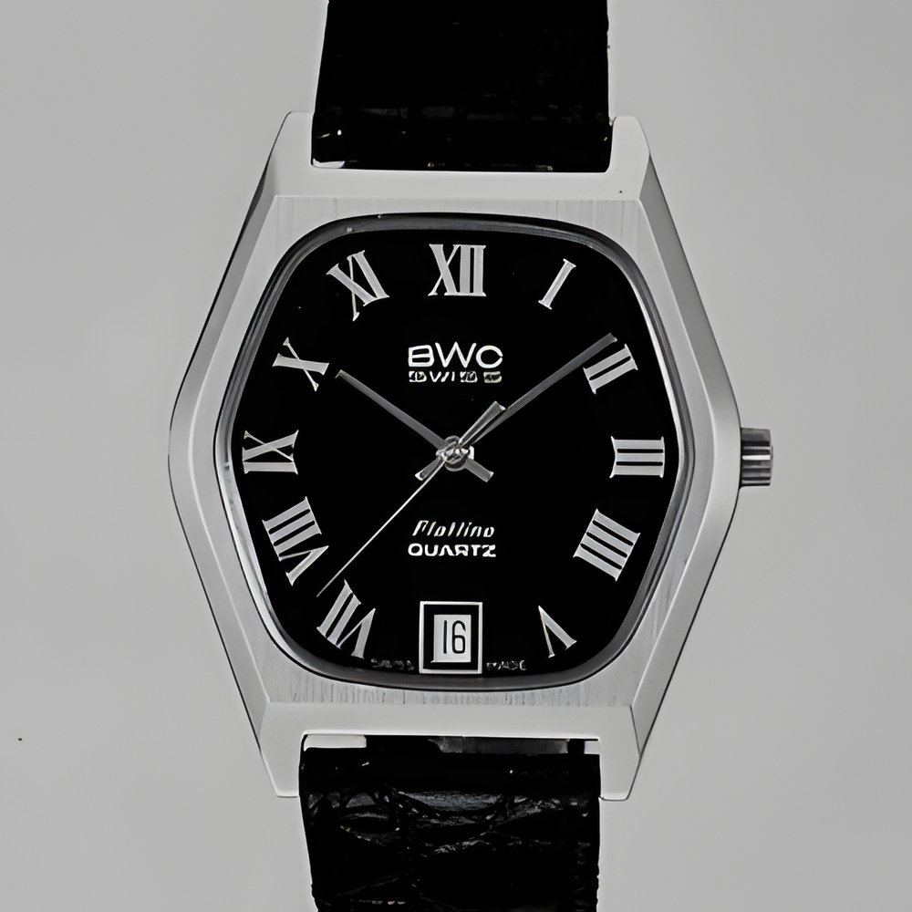 A new technology has now been acclimatised so styling moves back to the fore. Witness this extra-thin quartz model with water-resistant hexagonal case. Black dial with Roman numerals. (BWC BUTTES WATCH - Quartz)