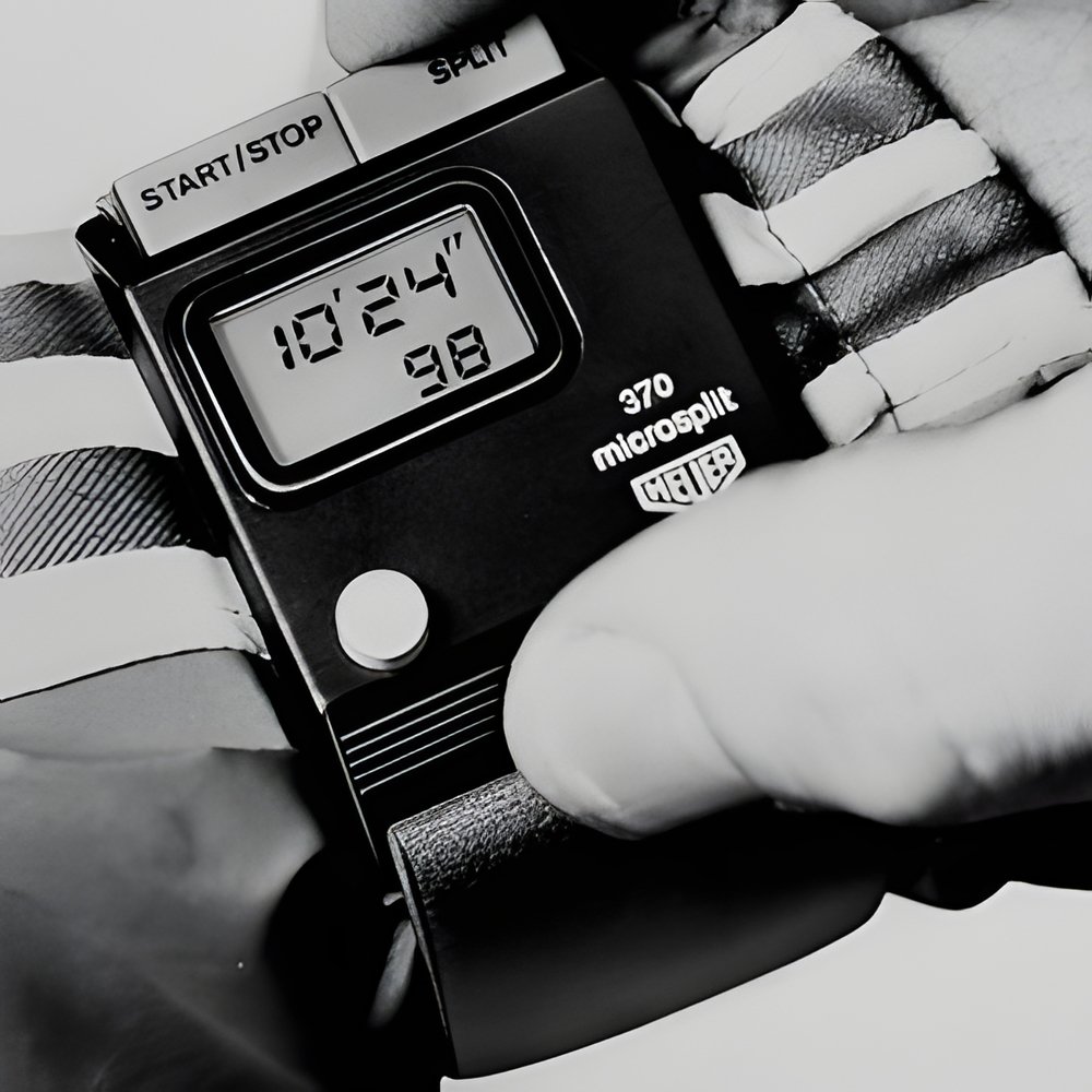 An electronic wrist-worn timer with LCD display that provides a readout of minutes, seconds and hundredths. It is designed for all individual short-time measurements : track and field, i9 swimming (the case is both rugged and water-resistant) Functions : start-stop and split, with intermediate-time readouts and “flyback” feature. (HEUER Microsplit 370)