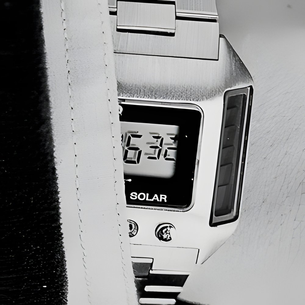 A new solar-powered model with a novel feature on this type of watch: the cells are positioned at the far right of the case so as not to be covered by a cuff or sleeve - one of the main drawbacks of such models up to now. 6-digit liquid crystal display (LCD). The battery has a life expectancy of 3 to 5 years. (SICURA - Solar)