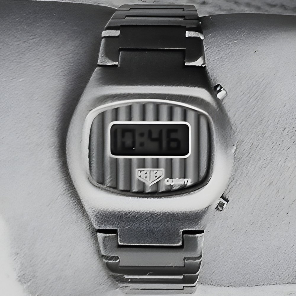 Small-diameter LCD design with sporty water-resistant case. Permanent readout of hours and minutes, seconds and calendar on command. (HEUER LCD-Lady)