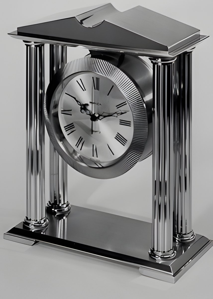 This period-style “4 column” table clock features a high-frequency 4,19 Megahertz quartz movement. The large (143 x 190 mm) case is solid brass (SWIZA)