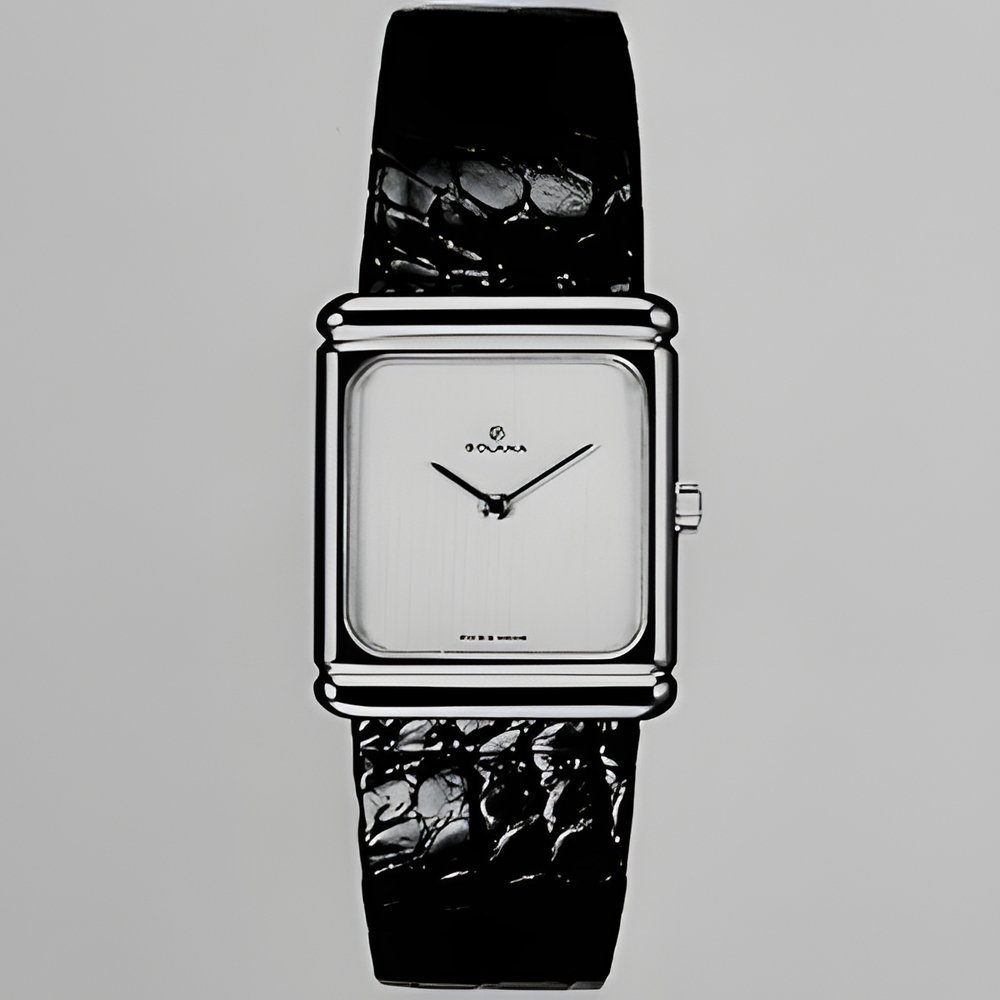 Strong simple lines blending classic and ’modern’ styling moods in this 2-tone model. The case is in 18K yellow gold while the horn covers are made of white gold. Choice of unadorned dial as pictured here, applied hour-markers or Roman numerals. (GOLANA)