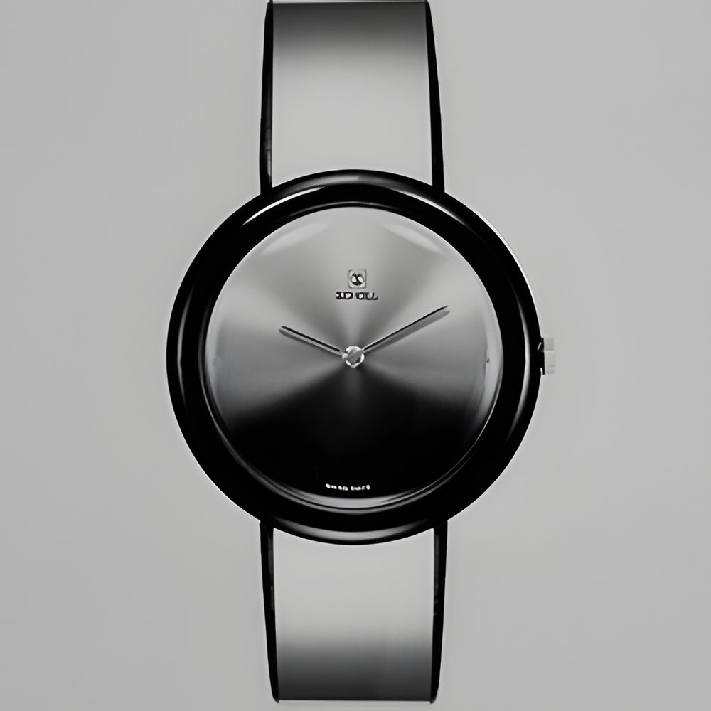 Reflecting the latest trends, this trim, neatly styled model features a black chrome bezel contrasting with its rhodium-plated case and dial. Shaded rhodium-and-black dial. (SCHOLL)