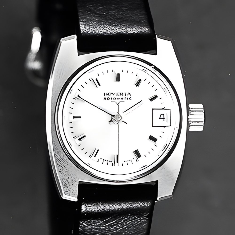 A lady’s seifwinding watch of unusually small diameter with centre second hand and calendar. Water-resistant goidpiate or Ultrinox case Silvered or coloured dial. (HOVERTA)