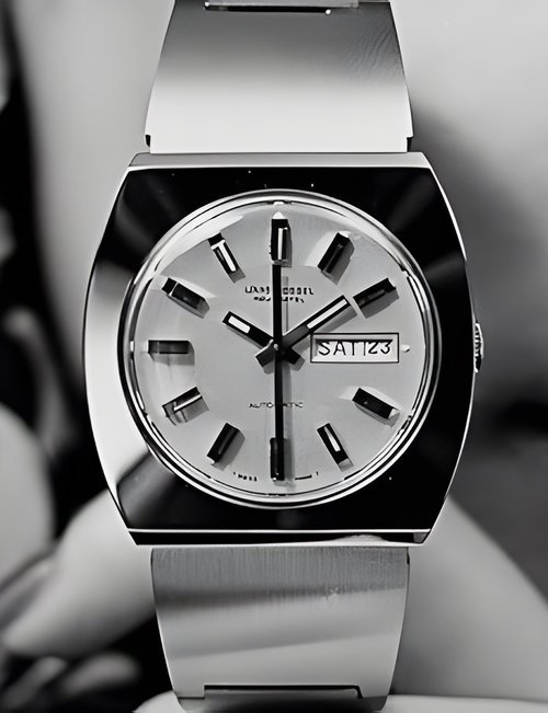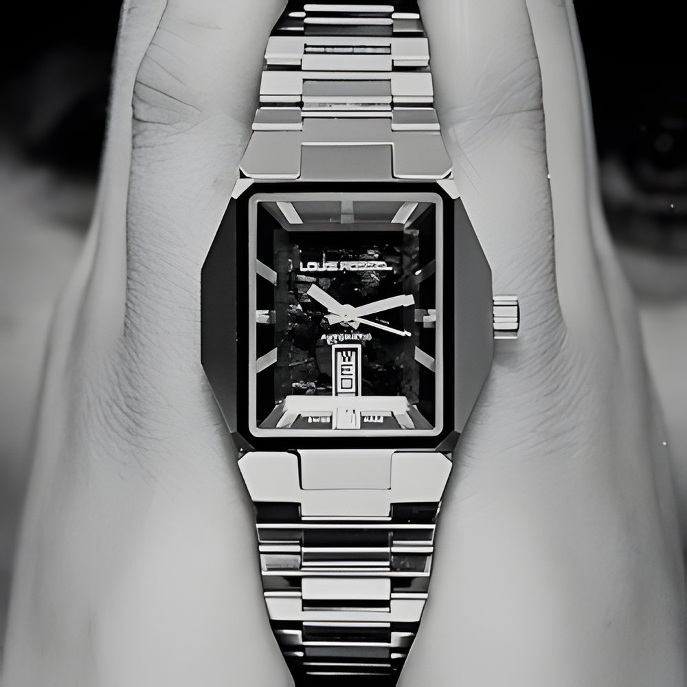 A watch with an unlimited self-contained power source : its own high-frequency selfwinding movement. Scratchproof case water-resistant to 50rn (5 atm) and sapphire crystal. Two-tone titanium dial. (LOUIS ROSSEL)