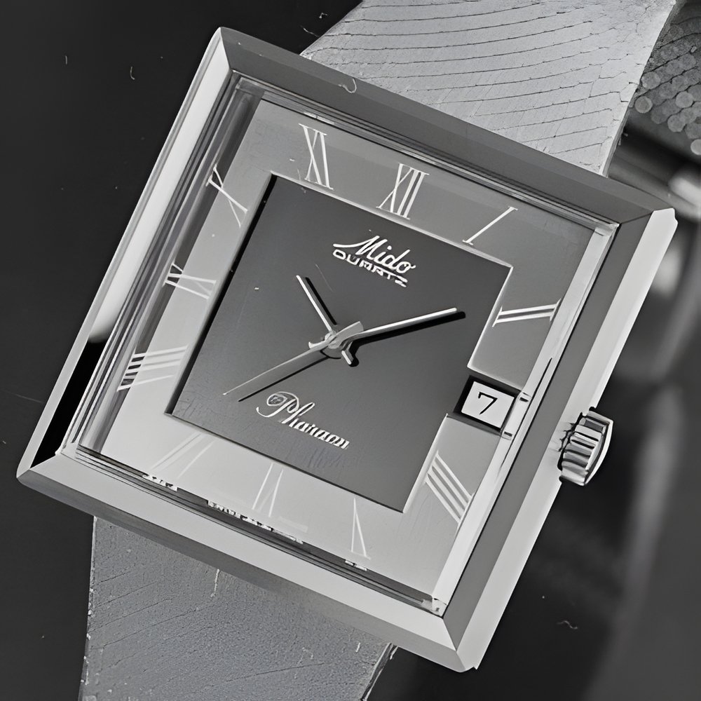 From Mido’s new collection of, analogue quartz watches: a modern, elegant and dependable model featuring the thinnest movement of this type now on the market with calendar and centre seconds. Roman numerals are back in vogue. (MIDO - Quartz Pharaon)