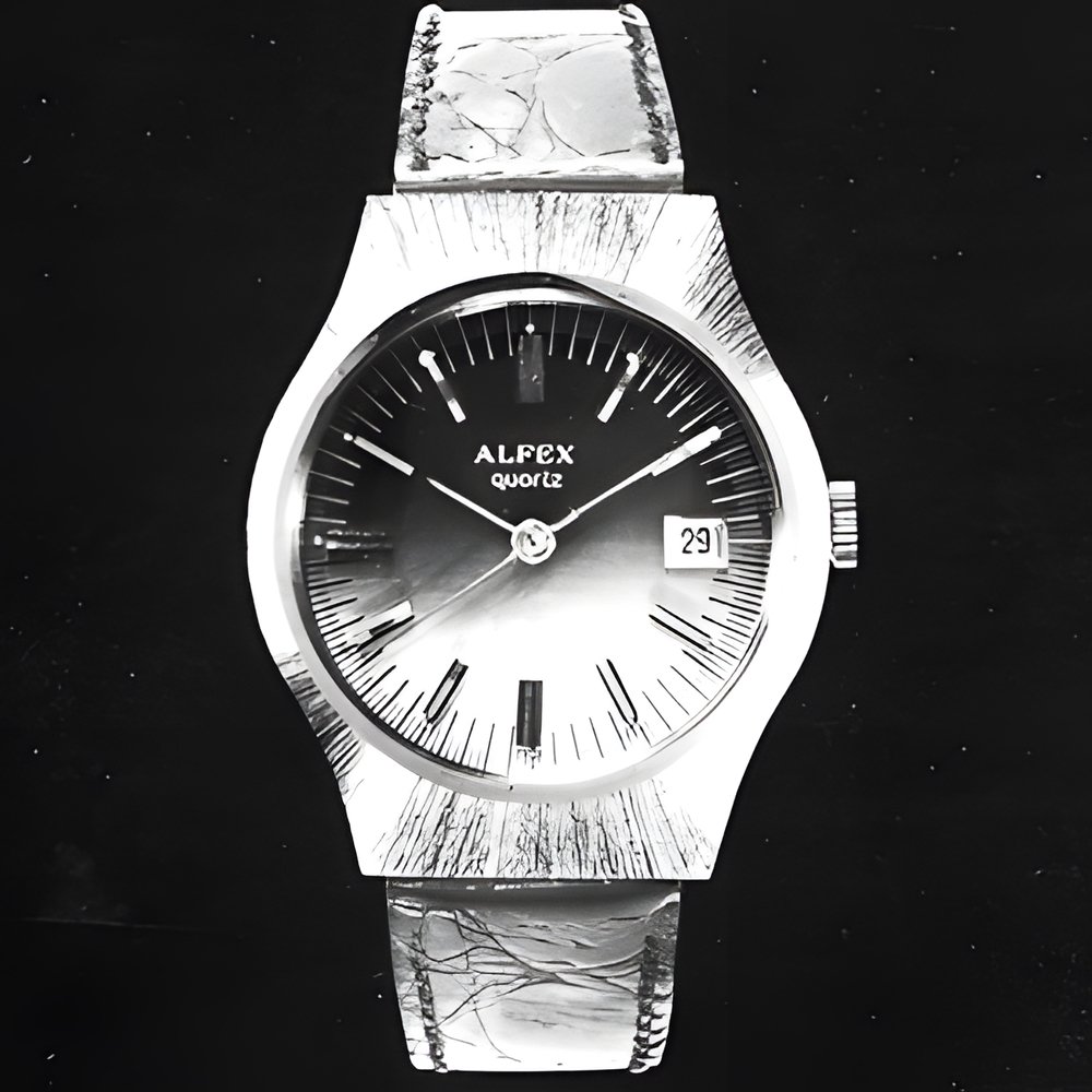 In the economical watch category, here is a new quartz analogue model designed not to vary by much more than 2 seconds a month. Centre seconds and calendar. (ALFEX)