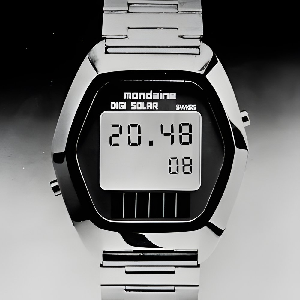 A solar-cell solid-state watch of entirely new design. The cells and battery were developed in tandem for greater operational efficiency. The cells themselves react to intense light only but 4 minutes’ exposure is enough to recharge the 60 Ah battery for one month. It requires a battery change only every 3 to 5 years. Its 6-digit alphanumeric display, designed specially by Brown Boven, features a calendar programmed to the year 2100. 12-hour or 24-hour cycle, selected simply by turning a screw. With nightlight. (MONDAINE Digi-Solar)