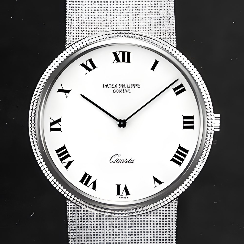 This ultra-slim and stylish Patek Philippe model features the world’s thinnest quartz analogue movement (2.50 mm thin). Water-resistant case and bracelet in 18K gold, Roman numerals on the dial. An interesting technical feature is that the minute hand moves in 5-second jumps to conserve battery power. (PATEK PHILIPPE Quartz)